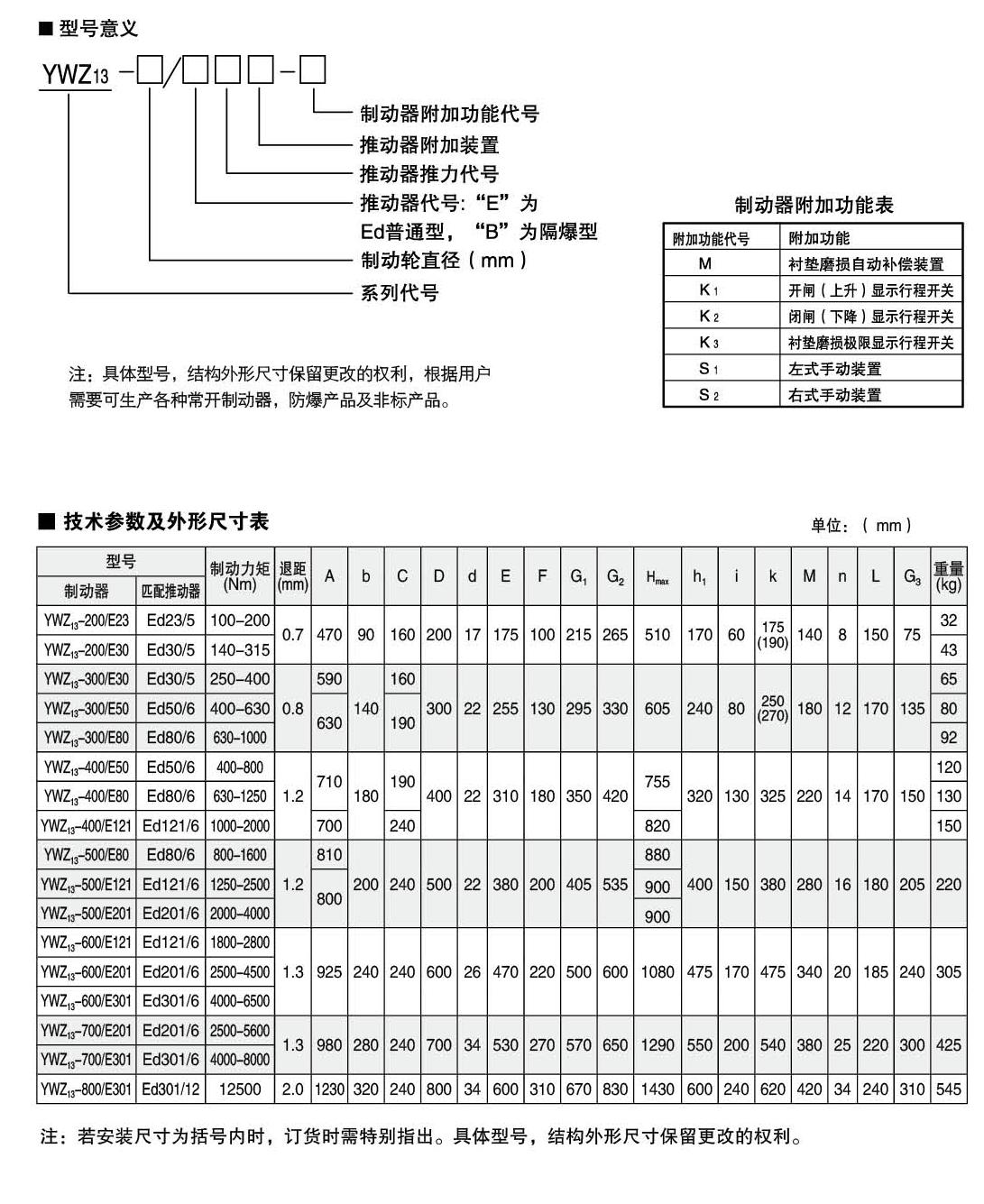YW,YWZ13系列電力液壓鼓式制動器的連接尺寸和技術(shù)要求符合JB / T6406-2006標準;制動力矩參數(shù)符合DIN15435標準,配套符合DIN15430標準的Ed系列推動器。