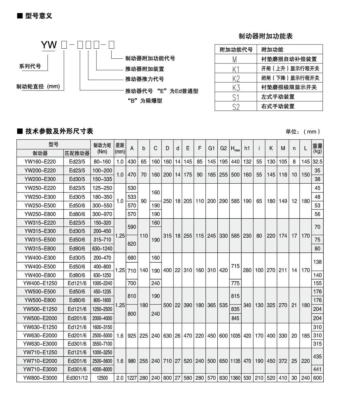 應(yīng)用:YW,YWZ13系列電力液壓鼓式制動器,廣泛應(yīng)用于有防爆要求的各種起重運輸、皮帶運輸、港口裝卸、冶金及建筑機械中各種機構(gòu)的減速和停車(維持)制動。符合標準:YW,YWZ13系列電力液壓鼓式制動器的連接尺寸和技術(shù)要求符合JB / T6406-2006標準;制動力矩參數(shù)符合DIN15435標準,配套符合DIN15430標準的Ed系列推動器。主要特點:▲ 聯(lián)鎖式退距均等裝置和瓦塊自動隨位裝置,可始終保持兩側(cè)瓦塊退距均等且無需調(diào)整,完全避免因退距不均使一側(cè)制動襯墊浮貼制動輪的現(xiàn)