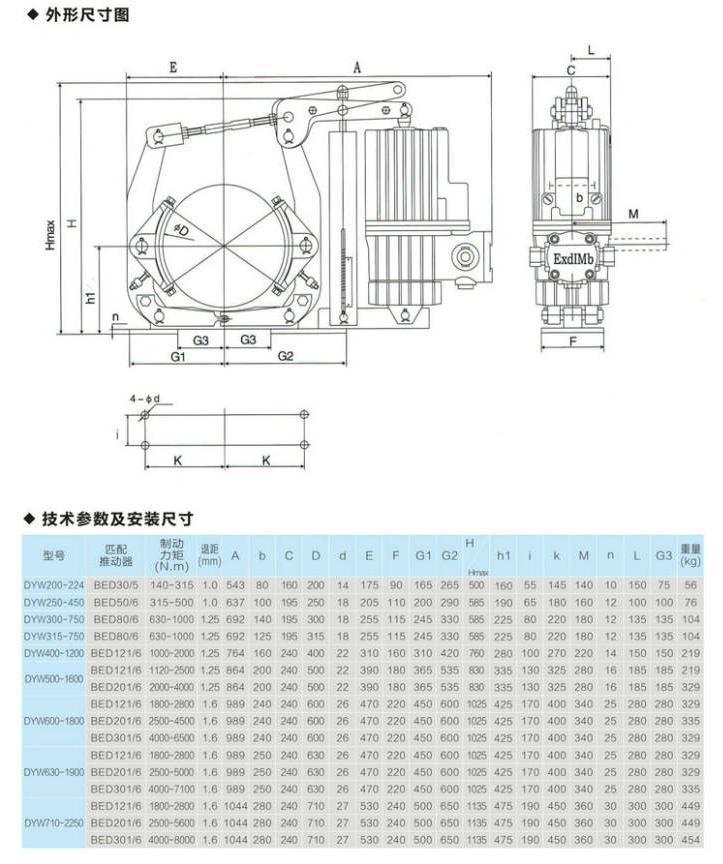 DYW,BYWZ5系列制動器連接尺寸和技術要求符合JB/T6406-2006標準,制動力矩參數(shù)符合DIN15435標準。DYWZ5系列制動器連接尺寸和制動力矩參數(shù)符合GB6333-86標準,技術要求符合JB/T6406-2006標準。DYW和DYWZ5系列鼓式制動器配套符合GB3836.2的Ed系列隔爆型推動器。本系列適用ⅡA、ⅡB、ⅡC溫度組別為T1-T4組可燃氣體與空氣形成的爆炸性混合物場所。